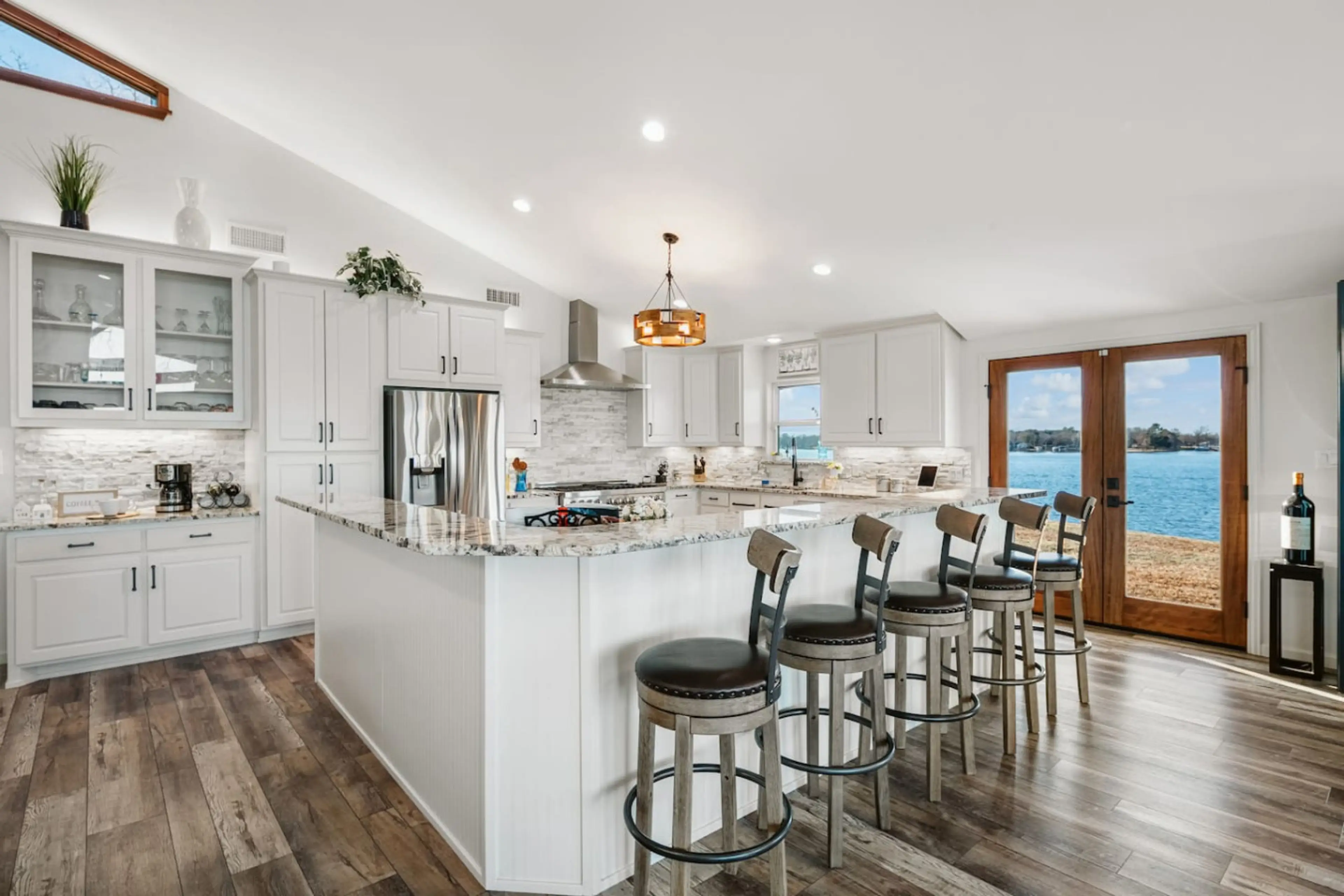God couldn't place a pin on a more perfect lake house location. This luxurious retreat is the cornerstone property at the end of the lake's most noted lake point & boasts unparalleled 270' views of shimmering water. Any lake desire can be fulfilled enjoying, Exclusive access to boat dock & 2 slips, ...